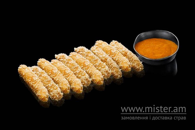 Куряче філе, яйце, панірувальні сухарі, борошно темпура, сіль, перець, соус горіховий (гострий).