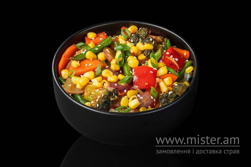 Рис, бульйон курячий, броколі, спаржа, перець болгарський, морква, цибуля синя, мікс імбир-часник, кукурудза, цибуля зелена, соус Пад Тай, кунжут.