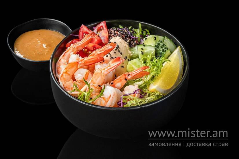 Креветки, кіноа, огірок, помідор, мікс салату, крем сир, соус Устричний, соус Азія BBQ, соус Ланч Кінг, соус Горіховий, лимон, кунжут.