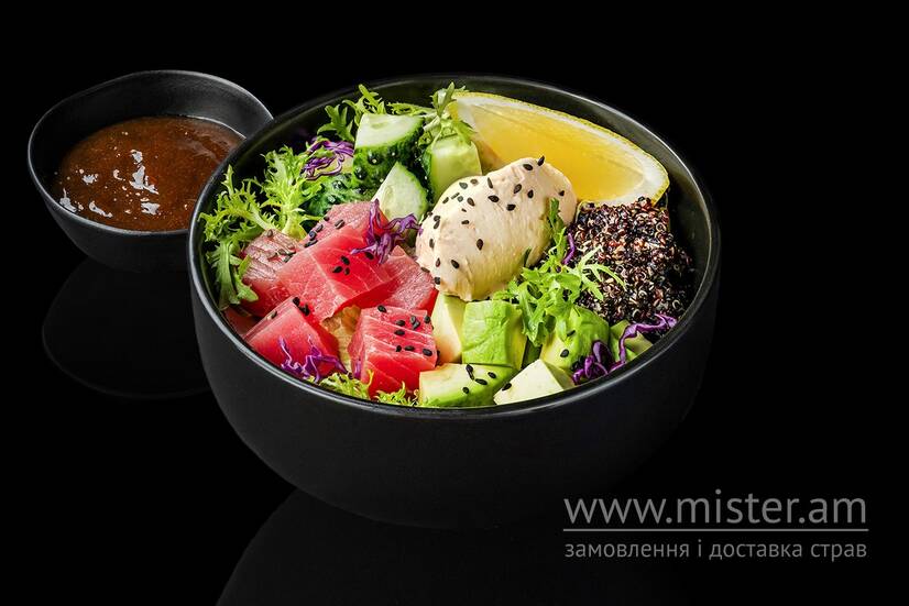Тунець, кіноа, огірок, авокадо, мікс салату, крем сир, соус Устричний, соус Азія BBQ, соус Ланч Кінг, соус Понзу, лимон, кунжут.