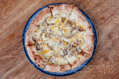 Вершковий соус, моцарела, білий гриб, гливи, пармезан, сир голандський, гриби сушені, пажитник, часникова олія.