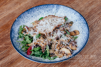 Філе телятини сувід, печериці, каперси, мікс салату, рукола, томати чері, пармезан, крутони.