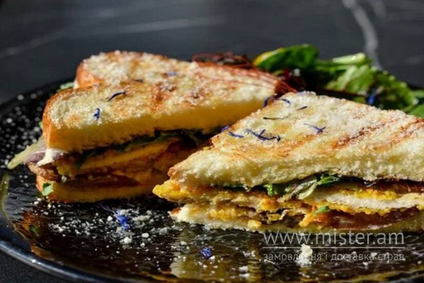 Бріош, курочка в паніровці, пецериці, Пармезан, томати, мікс салату та соус сендвіч.