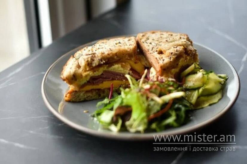 Цільнозерновий хліб, скрембл, рвана яловича, сир Чедер, сир Моцарела, карамелізована цибуля, мариновані огірочки та мікс салату.