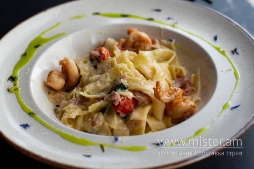 Фетучіні, тигрова креветка, бекон, томати, шпинат, соус вершковий, пармезан.