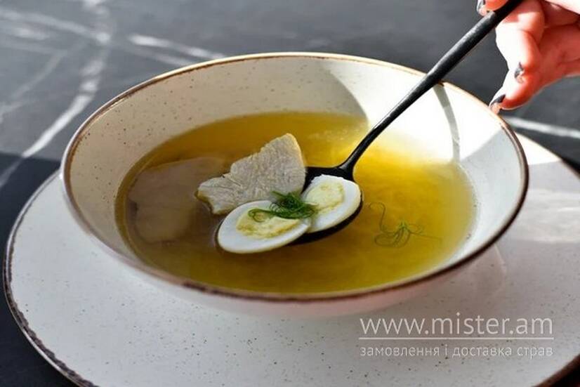 Класичний бульйон із дрібною пастою, курячим філе та перепелиним яйцем.