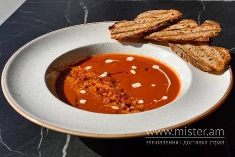 Пікантний суп з томатів пелаті та вершками, подається з хрумкими чіпсами темного хліба та бекону, тертим Пармезаном.