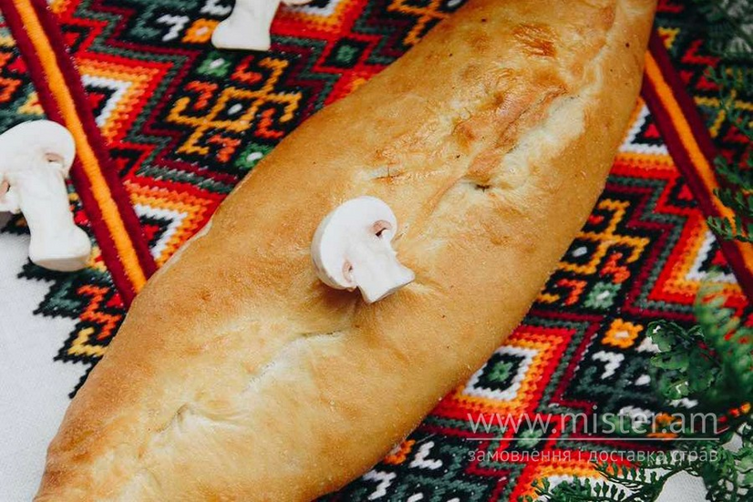 Тісто дріжджове, печериці, цибуля, спеції, сулугуні.
