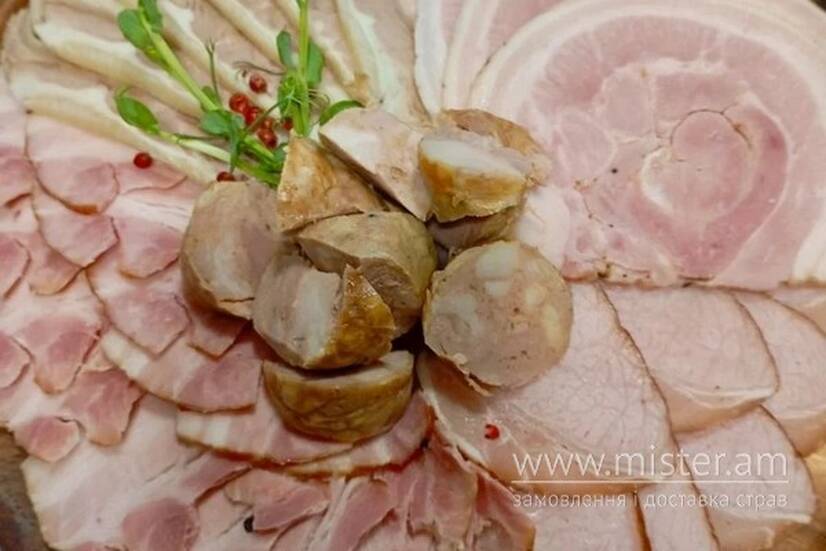 Домашня ковбаса, шинка, підчеревина, рулька, м`ясний рулет.