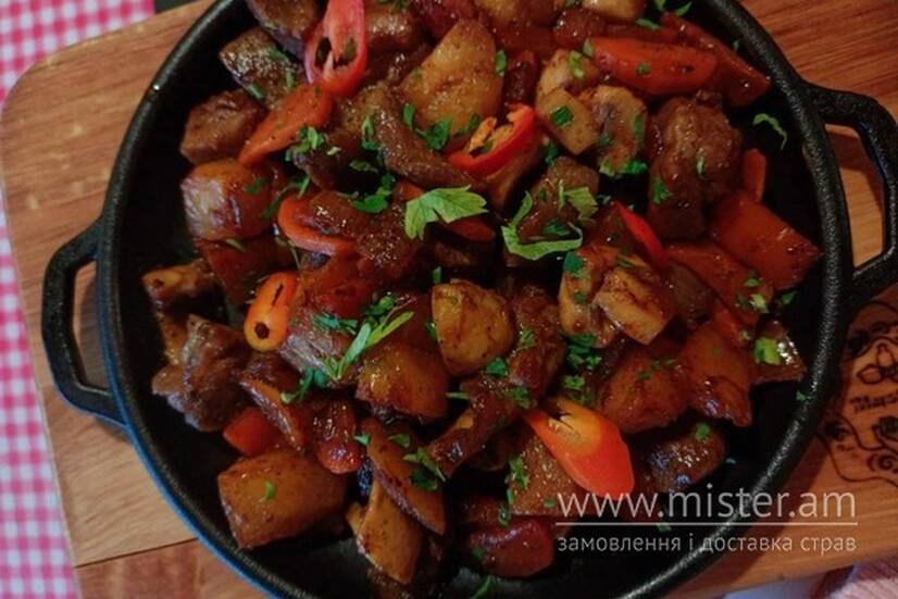 Свинина, картопля, морква, шампіньони, цибуля, перець болгарський, перець чилі.