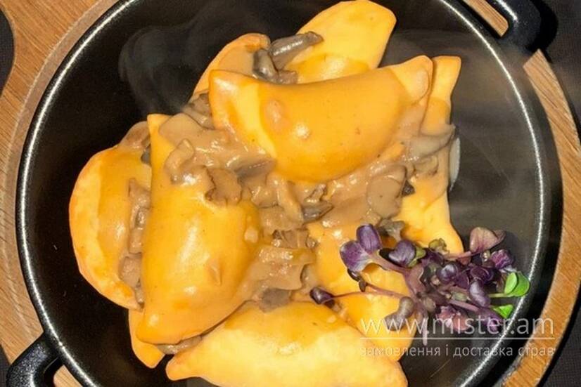 Смажені вареники з картоплею та грибною підливою