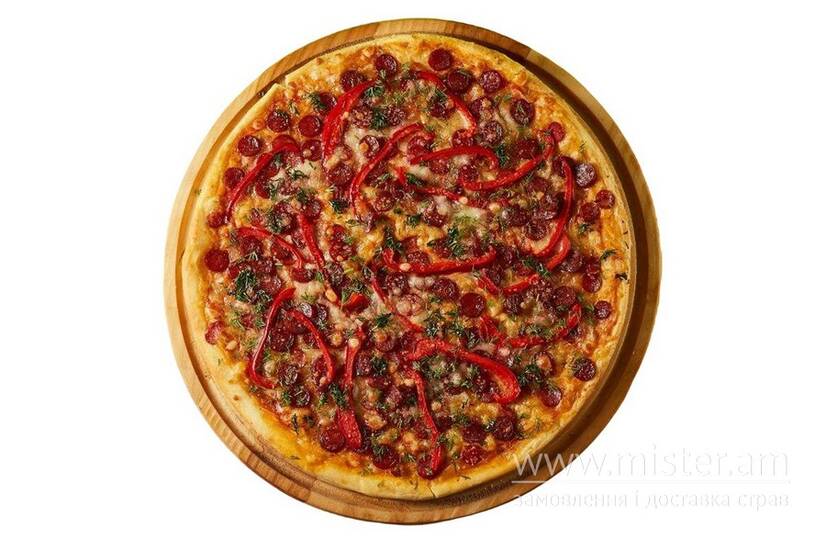 Соус томатний, базилік, перець гострий, моцарела, салямі піканте, салямі, маслини.