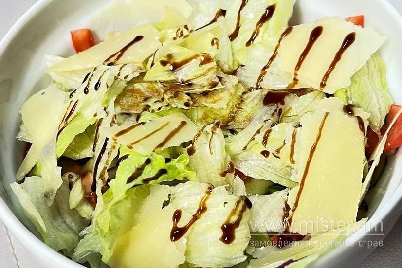 Салат айсберг, помідори, пармезан, цибуля синя, огірки, оливкова олія, соус бальзамічний.