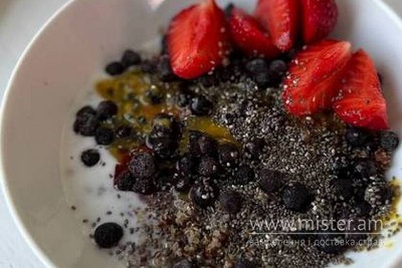 Кіноа, грецький йогурт, сезонні ягоди та фрукти, насіння льону, коноплі, горіхи.