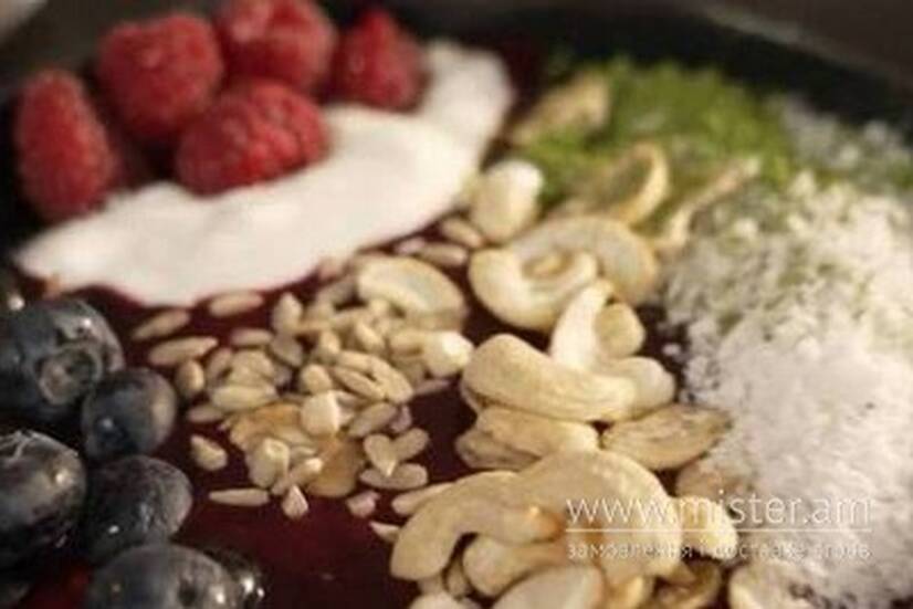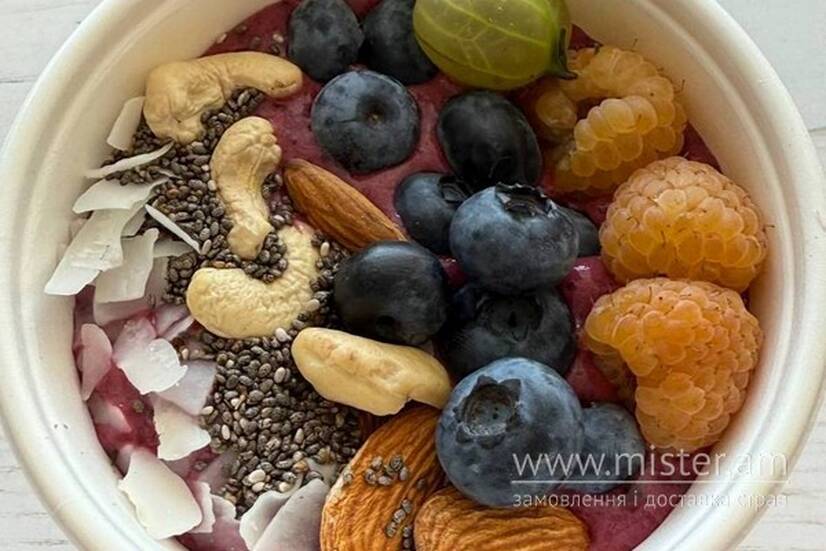 Цей смузі боул поєднує ожину, смородину, полуницю, лохину, яблуко, лимон, кокосове молоко ,матча та рослинний протеїн. З додаванням горіхів та насіння (кеш`ю,льону,кунжуту, соняшника) він стане ідеальним сніданком чи перекусом.