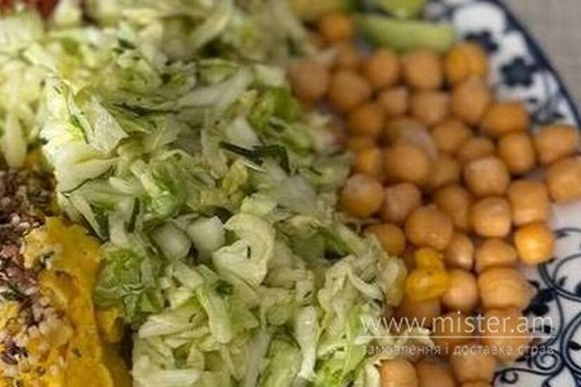 Cкрембл з тофу на оливковій олії, зелень та овочі, нут, насільоння льону, кунжуту та коноплі, горіхи.