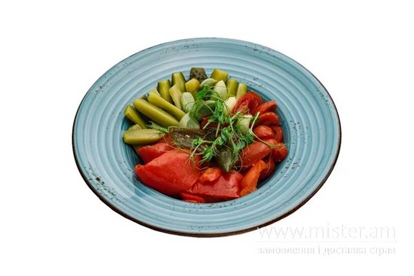 Огірок, помідори чері, ротунда та часник з погребу з заморським димним перцем.