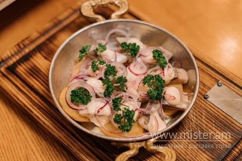 Оселедець пряного посолу, картопля смажена на смальці, маринована цибуля та майонез з зеленню.