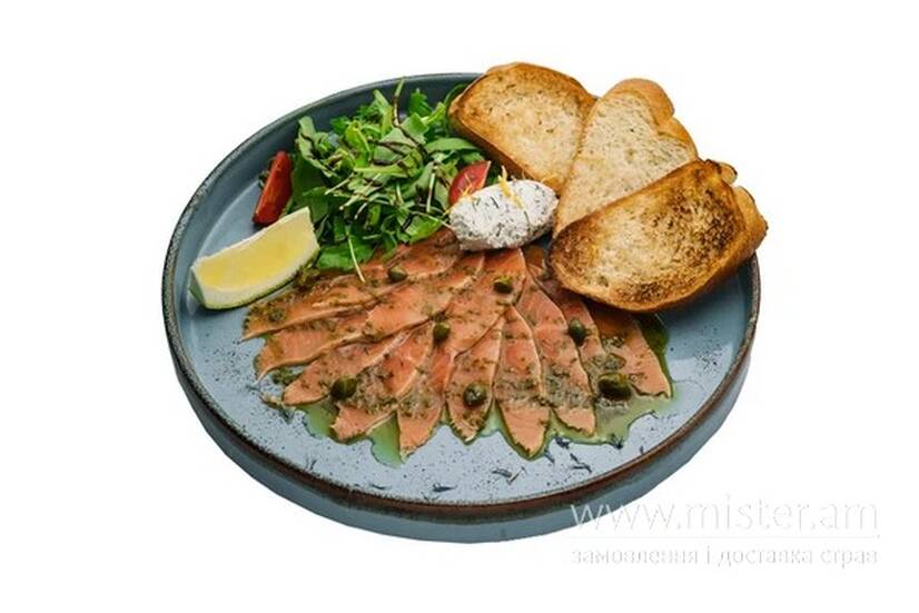 Солений слізьми колишніх лосось, та хлопнутий стародавнім соусом альята, бутони чагарника, багет з намазанкою з крем-сиру та волоського горіха, каперси, чері та мікс різної зелені.