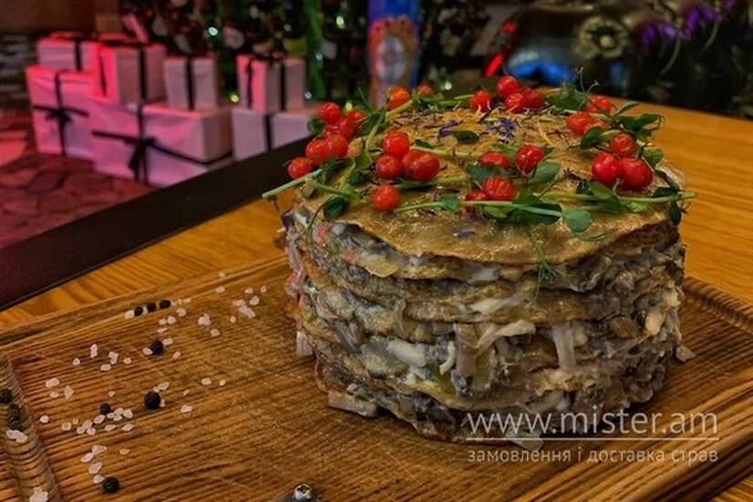 Печінка теляча, млинці на молоці, майонез, цибуля, гриби.