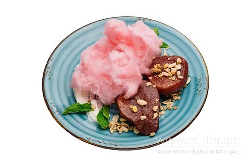 Компресована зі спеціями та вином груша, витримана на пару, солодкий сирний соус, цукрова вата та горіх.