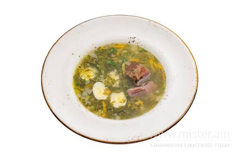 Класичний український суп з щавлю та бульйону птиці. Подаємо зі сметаною, перепелиними яйцями та копченим свинним ребром.