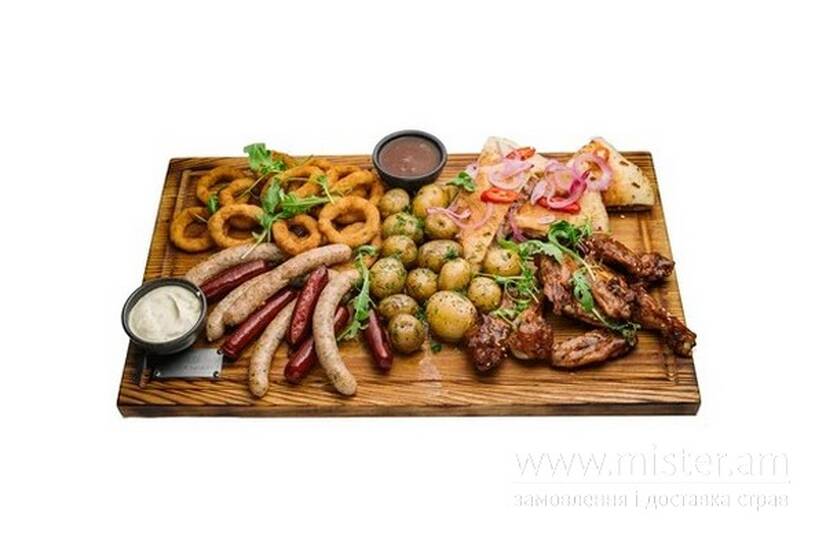 Крила BBQ, мисливські ковбаски, мюнхенські ковбаски, цибулеві кільця, рвана свинина з перцем халапеньо у лаваші, картопля молода та соуси.