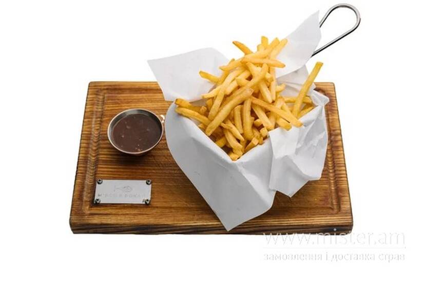 Бульба власноруч нарізана і смажена у великій кількості олії,соус барбекю.
