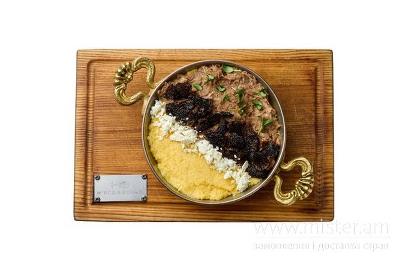 Кукурудзяна каша приготовлена на сметані разом зі смаженими грибами з Карпат, рвана свинина та бринза.