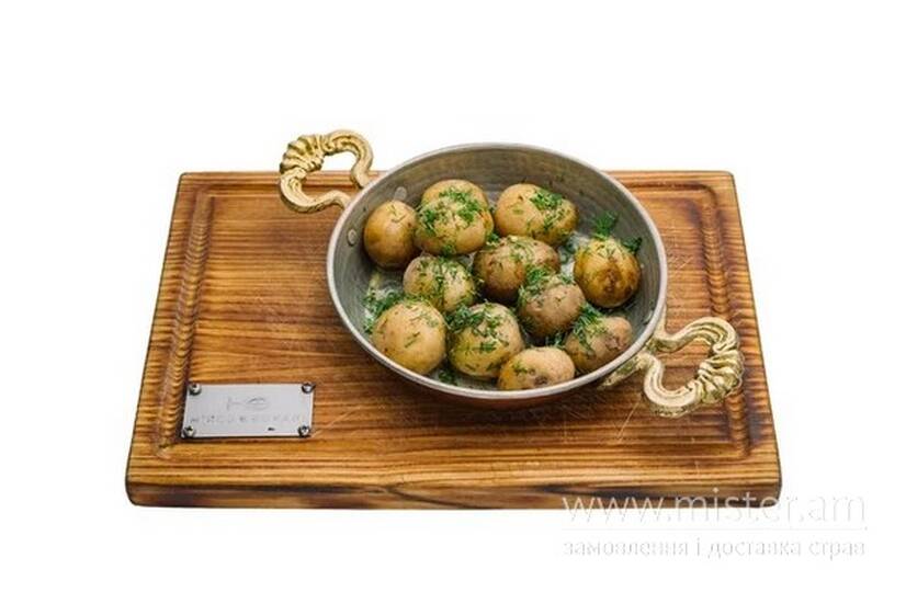 Картопля молода, соус з копченого сиру, поліський шпек, чіпси цибулеві, лемішка.