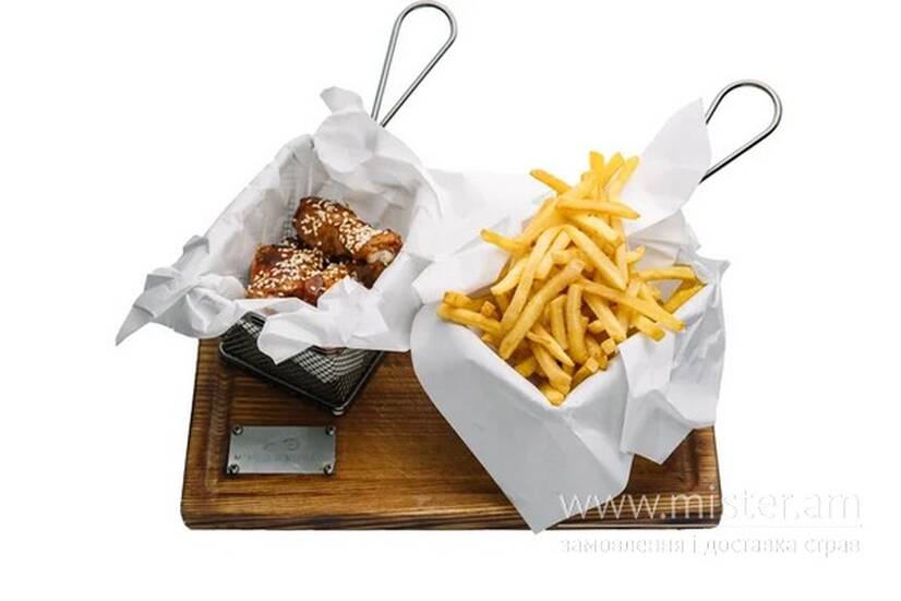 Сувідовані фаланги птиці запечені з соусом барбекю та кунжутом. Подаються з картоплею фрі.