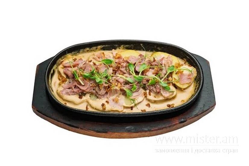 Рвана свинина, картопля печена, карамелізовна цибуля, копчений бочок.