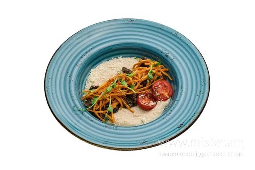 Пюре з селери, батат фрі, сморчки (гриби зморшки) волинські, пармезан, помідор чері, мікс салату.