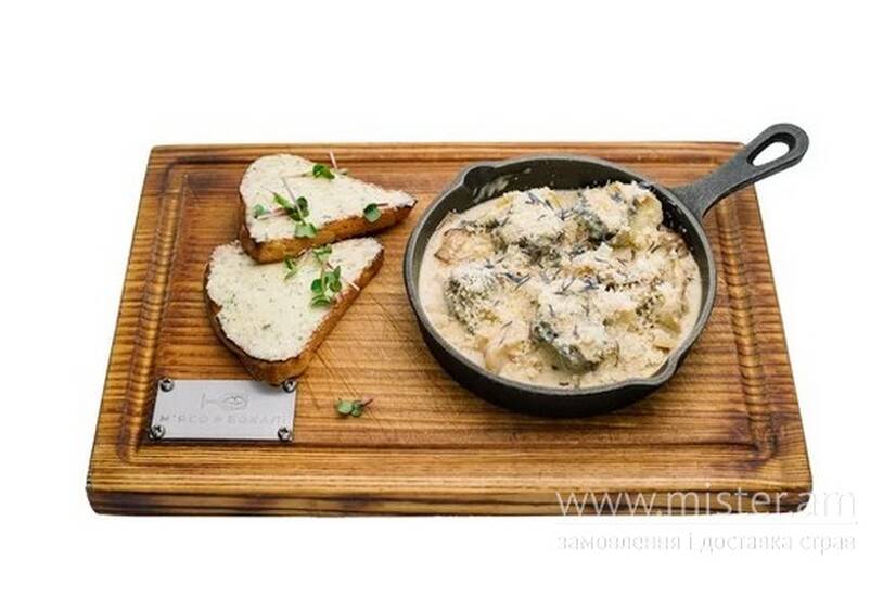 Морські хижі равлики, котрих дістали з мушлі запекли з печерицями та білими грибами, соус з вершків та сметани, пармезан, подаємо з крафтовим хлібом з намазкою.