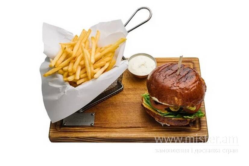 Бургер з яловичою котлетою, чедером, листям айсбергу, маринованим огірком, помідорами та цибулею у домашньому бріоші змащеному солодкою американською гірчицею та соусом тар-тар. Гарнірується картоплею фрі та часниковим соусом.