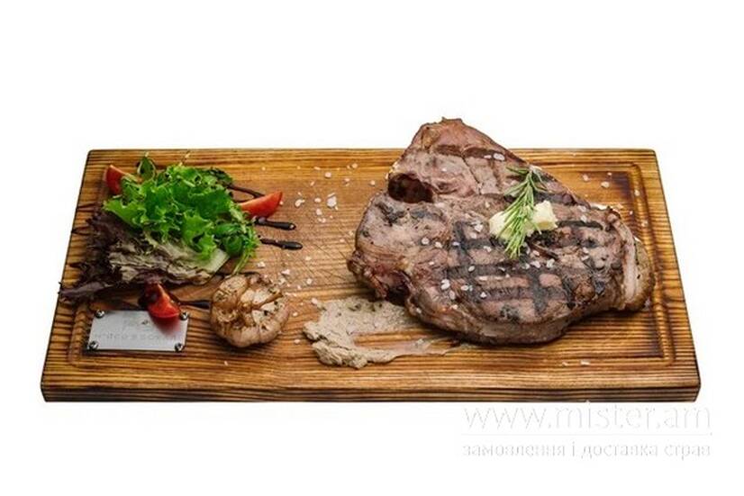 Стейк на кості, що складається з вирізки та товстого краю смажений у печі. Подаємо з запаченим часником та соусом з перцю та вершків.