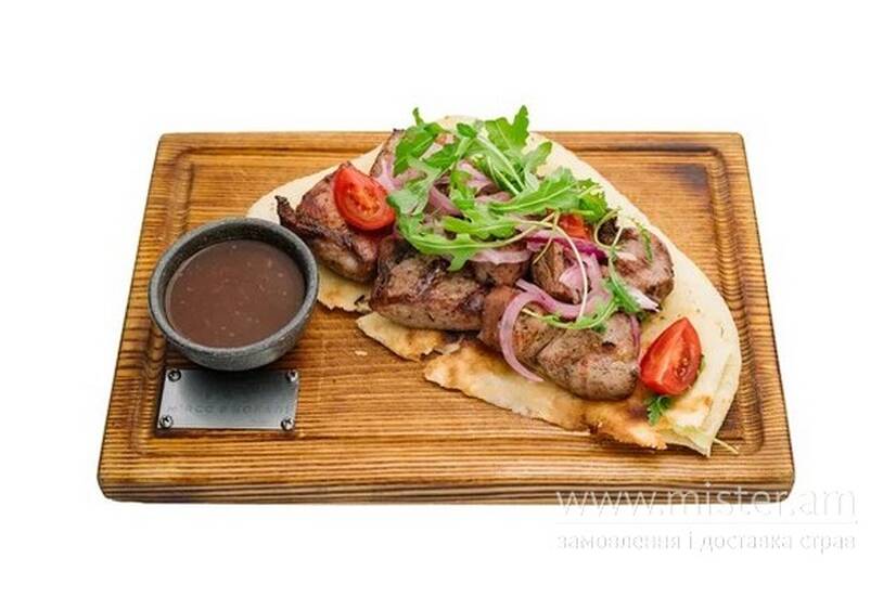 Маринована карковина у спеціях та содовій. Подається з хлібом фокачча, маринованою синьою цибулею та соусом барбекю.