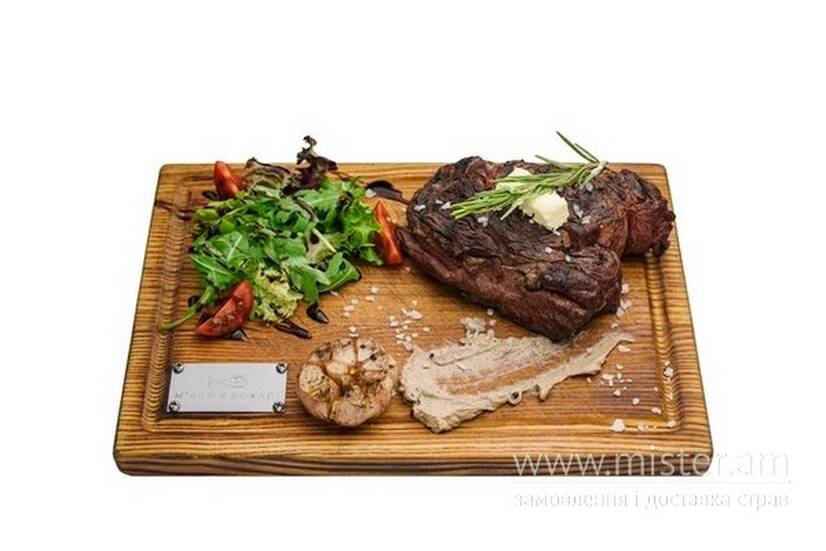 Стейк з товстого краю яловичого відруба з 6 по 12 ребро, смажений у хоспері з розмарином та тим`яном. Подаємо з запеченим часником та соусом з перцю та вершків.