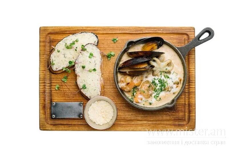 Мідії з привозу, восьминіг, королівська креветка, чілійська мідія, кальмар, пармезан, мікрогрін, кріп, вершково-сметанний соус, моцарела, синя цибуля, часник та грінки з печеним часником.