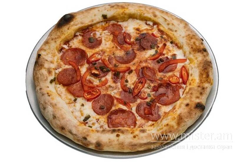 Моцарелла, соус з тертих томатів, Угорський сильний Степан, соус з перцю баранячий ріг, Salame Piccante, Сирокопчена папероні, chili papper, болгарський перець, халапеньо, каєнський жгучий перець.