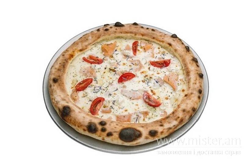 Вершковий соус, моцарелла, вуджений лосось, креветки коктейльні, dorblu, помідор чері, фета, орегано та волошка.