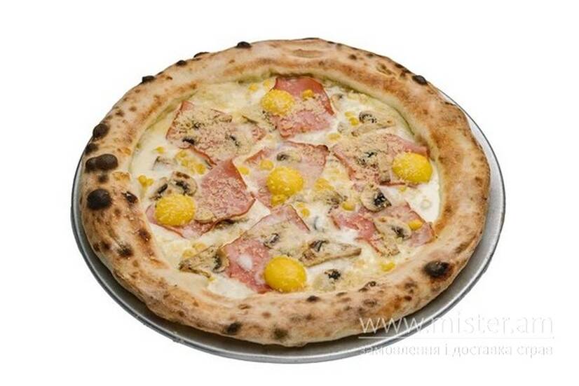 Моцарелла, вершковий соус, перепелині жовтки, вуджениця, цукрова кукурудза, пармезан, печериці.