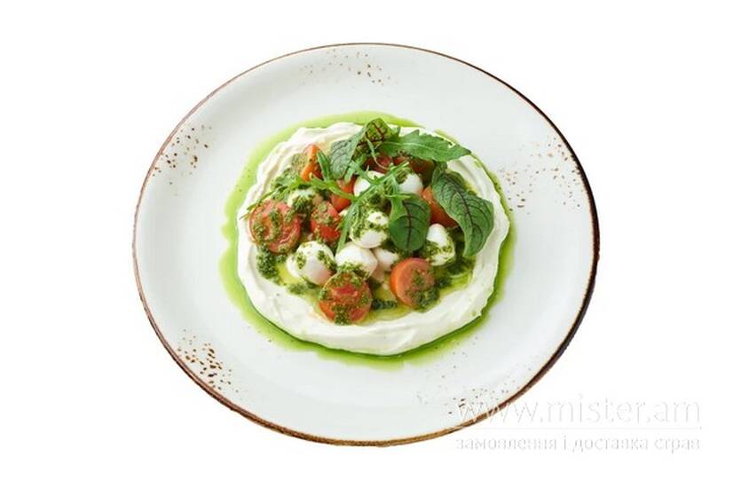 Вершковий соус, міні моцарелла, соус песто та мікс салату.