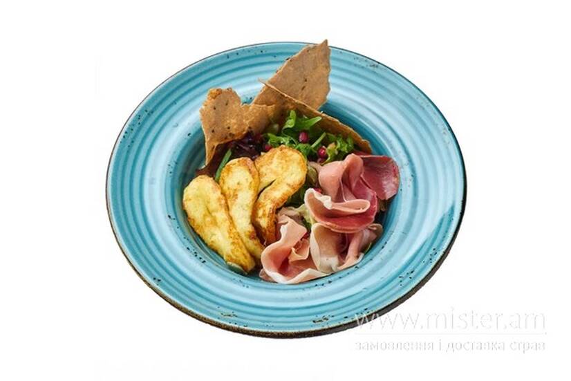 Мікс салату, ароматна олія, халумі гриль, лемішка з насінням гарбуза, паштет з печериць та в`ялений окорок.