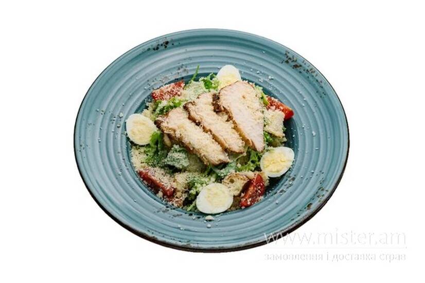 Мікс салату з крутонами заправлений емульсією з оливкової олії, пармезану, часнику та анчоусів у поєднанні з чері, печеною у прянощах курячою грудкою, перепелиними яйцями та італійським витриманим сиром.