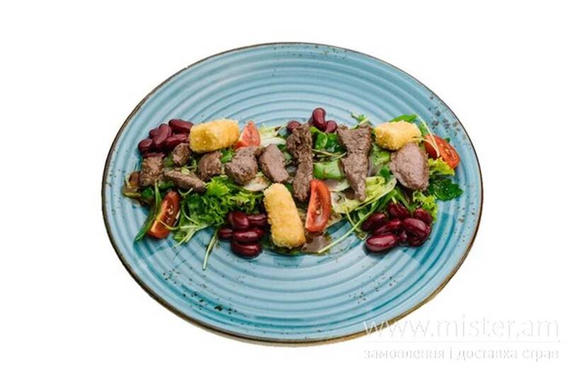 Мікс салату, сир брі у паніровці, теляча вирізка, чері, квасоля маринована, соус барбекю, бальзамік.
