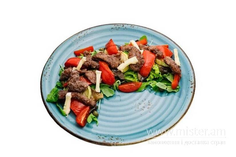 Болгарський перець, цукіні та баклажан з печі, мікс салату, чері, смажена яловичина, каперси, сир брі, ароматна олія.