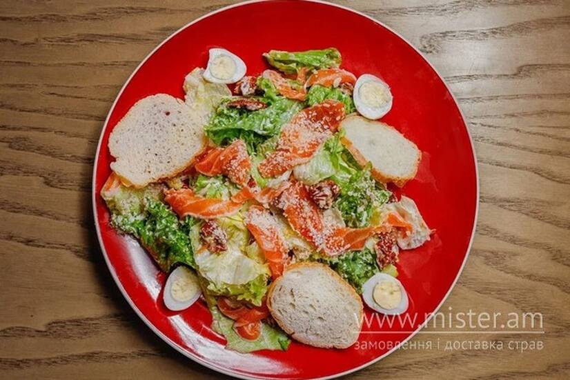 Лосось маринований, мікс-салат, яйце перепелине, помідори в`ялені, крутони, пармезан, соус “Цезар".