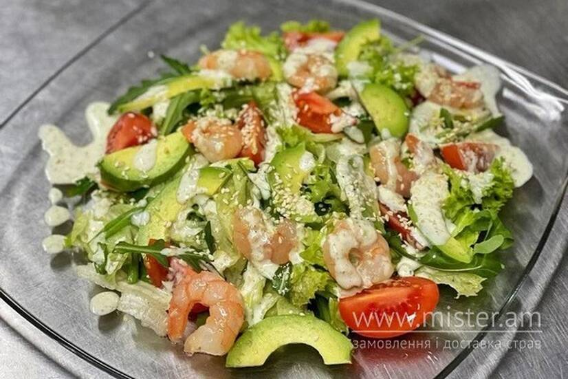 Авокадо, королівські креветки, помідори черрі, мікс-салат, кунжут, йогуртовий соус.