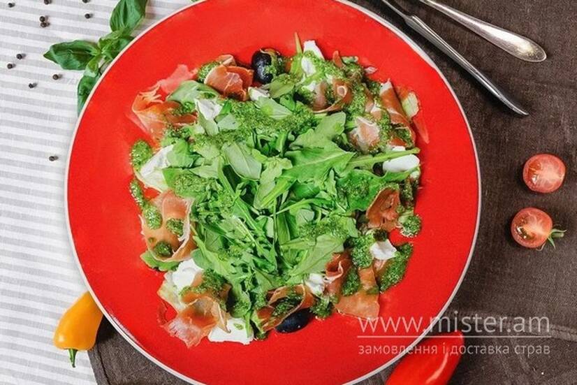 Крем-сир, прошутто крудо, помідори, мікс-салат, маслини, соус “Песто".